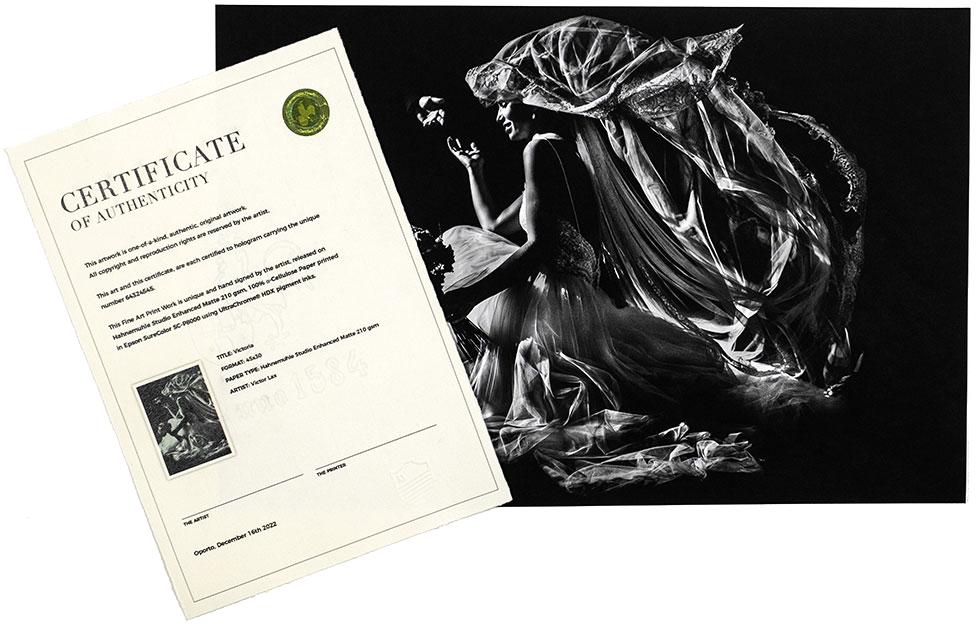 El Certificado de Autenticidad añade aún más valor a tu trabajo, ya que garantiza, a través de un número único, ¡que se trata de una obra única en papel Hahnemühle FineArt y que convertirá tu trabajo en una verdadera obra de arte!